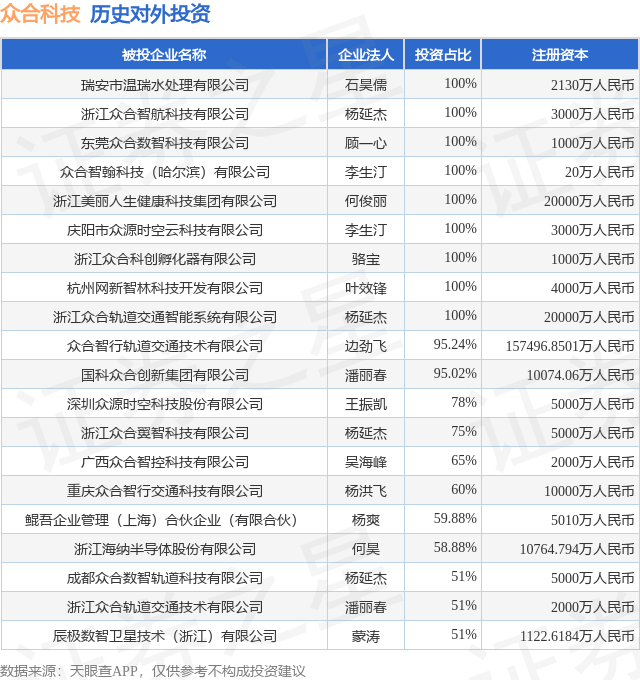 证券之星消息,根据天眼查APP显示,众合科技(000925.SZ)新增一起对外投资事件,被投资公司为浙江众合翼智科技有限公司,法定代表人杨延杰,投资占比为75%。该公司从事软件和信息技术服务业,注册资本为5000万人民币。目前,众合科技共存在对外投资41项,投资占比前20的项目见下表:
