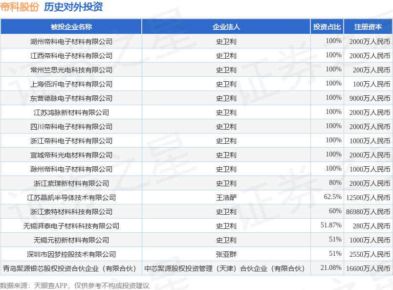 证券之星消息,根据天眼查APP显示,帝科股份(300842.SZ)新增一起对外投资事件,被投资公司为湖州帝科电子材料有限公司,法定代表人史卫利,投资占比为100%。该公司从事计算机、通信和其他电子设备制造业,注册资本为2000万人民币。目前,帝科股份共存在对外投资17项,详见下表: