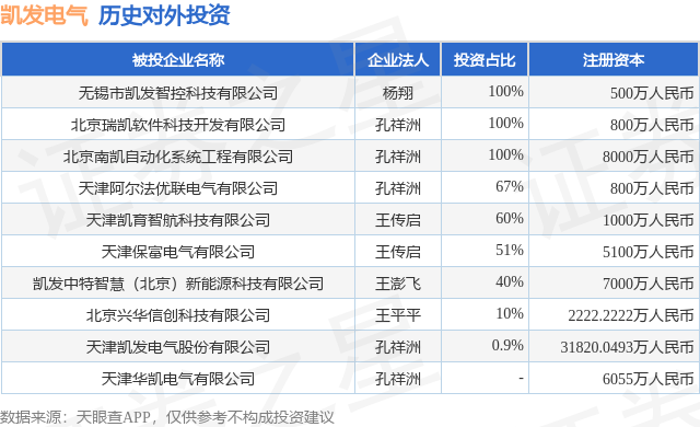 通过天眼查大数据分析,天津凯发电气股份有限公司共对外投资了9家企业,参与招投标项目2427次;财产线索方面有商标信息5条,专利信息188条,著作权信息264条;此外企业还拥有行政许可43个。据2024年报数据,凯发电气商誉2.22万元,同比未变化。