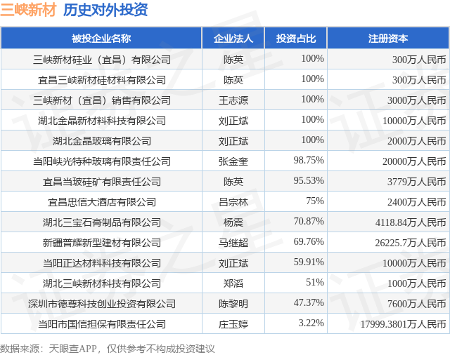 证券之星消息,根据天眼查APP显示,三峡新材(600293.SH)新增一起对外投资事件,被投资公司为三峡新材硅业(宜昌)有限公司,法定代表人陈英,投资占比为100%。该公司从事非金属矿物制品业,注册资本为300万人民币。目前,三峡新材共存在对外投资14项,详见下表: