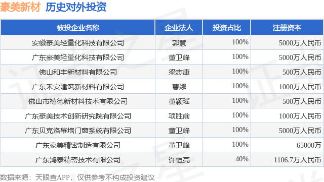 证券之星消息,根据天眼查APP显示,豪美新材(002988.SZ)新增一起对外投资事件,被投资公司为安徽豪美轻量化科技有限公司,法定代表人郭慧,投资占比为100%。该公司从事汽车制造业,注册资本为5000万人民币。目前,豪美新材共存在对外投资9项,详见下表: