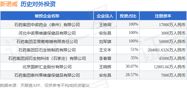 证券之星消息,根据天眼查APP显示,新诺威(300765.SZ)新增一起对外投资事件,被投资公司为石药集团润石生物科技(石家庄)有限公司,法定代表人李春雷,投资占比为35%。该公司从事医药制造业,注册资本为45000万人民币。目前,新诺威共存在对外投资7项,详见下表: