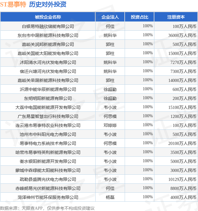 证券之星消息,根据天眼查APP显示,ST易事特(300376.SZ)新增一起对外投资事件,被投资公司为白银易特融欣储能有限公司,法定代表人何佳,投资占比为100%。该公司从事电力、热力生产和供应业,注册资本为100万人民币。目前,ST易事特共存在对外投资86项,投资占比前20的项目见下表:
