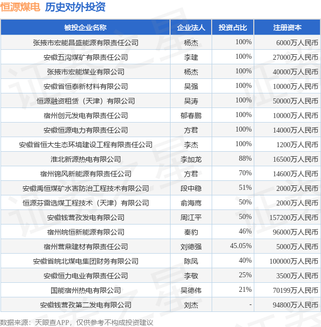 证券之星消息,根据天眼查APP显示,恒源煤电(600971.SH)新增一起对外投资事件,被投资公司为安徽钱营孜第二发电有限公司,法定代表人刘杰,投资占比为-。该公司从事电力、热力生产和供应业,注册资本为94800万人民币。目前,恒源煤电共存在对外投资19项,详见下表:
