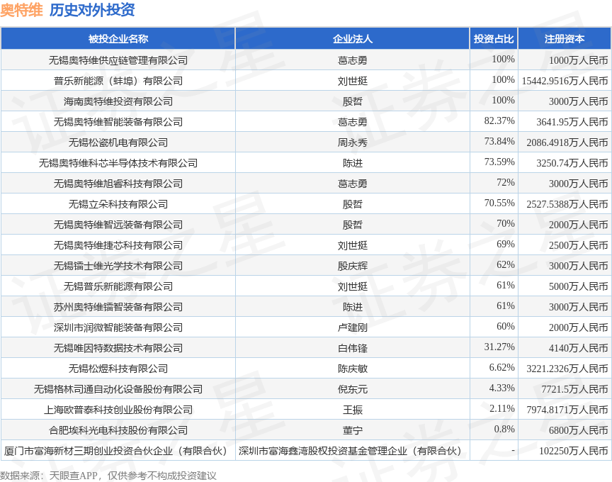 证券之星消息,根据天眼查APP显示,奥特维(688516.SH)新增一起对外投资事件,被投资公司为苏州奥特维镭智装备有限公司,法定代表人陈进,投资占比为61%。该公司从事计算机、通信和其他电子设备制造业,注册资本为3000万人民币。目前,奥特维共存在对外投资20项,详见下表: