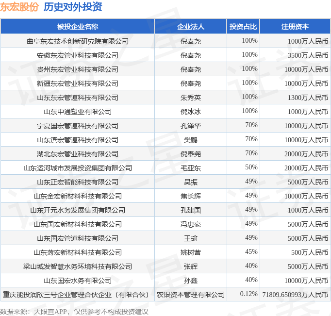 证券之星消息,根据天眼查APP显示,东宏股份(603856.SH)新增一起对外投资事件,被投资公司为曲阜东宏技术创新研究院有限公司,法定代表人倪奉尧,投资占比为100%。该公司从事科技推广和应用服务业,注册资本为1000万人民币。目前,东宏股份共存在对外投资19项,详见下表:
