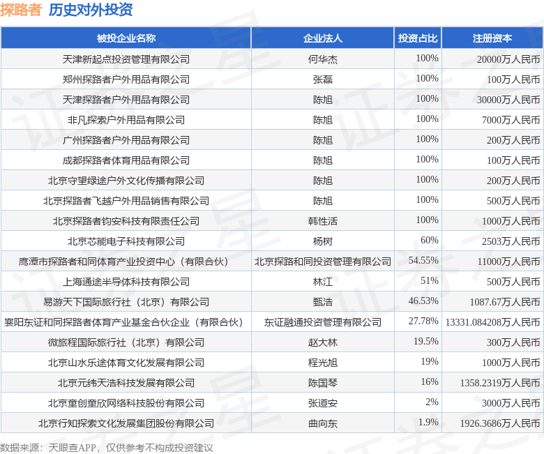 通过天眼查大数据分析,探路者控股集团股份有限公司共对外投资了23家企业,参与招投标项目133次;财产线索方面有商标信息854条,专利信息214条,著作权信息5条;此外企业还拥有行政许可7个。据2024年报数据,探路者商誉1.81亿元,同比减21.34%。长期股权投资1.03亿元,同比增135.0%。