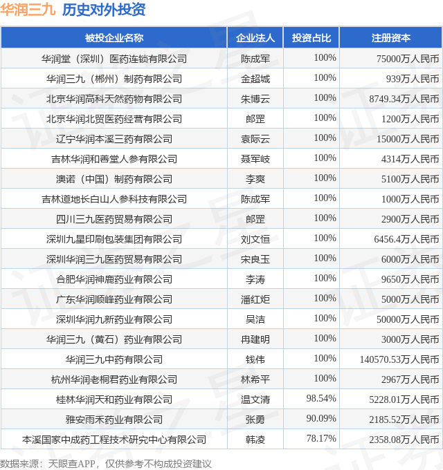 证券之星消息,根据天眼查APP显示,华润三九(000999.SZ)新增一起对外投资事件,被投资公司为华润堂(深圳)医药连锁有限公司,法定代表人陈成军,投资占比为100%。该公司从事零售业,注册资本为75000万人民币。目前,华润三九共存在对外投资41项,投资占比前20的项目见下表: