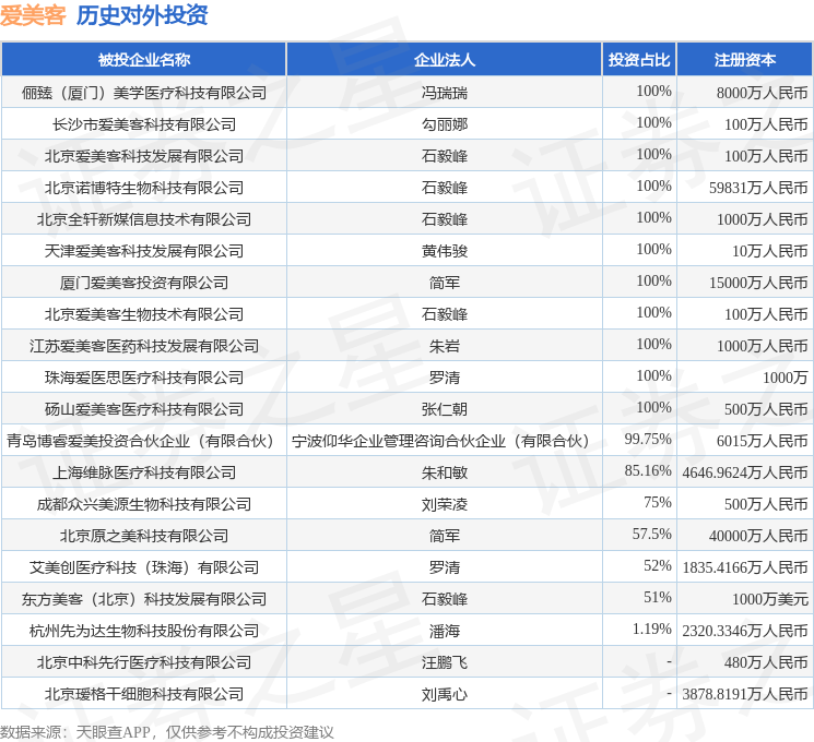 证券之星消息,根据天眼查APP显示,爱美客(300896.SZ)新增一起对外投资事件,被投资公司为俪臻(厦门)美学医疗科技有限公司,法定代表人冯瑞瑞,投资占比为100%。该公司从事批发业,注册资本为8000万人民币。目前,爱美客共存在对外投资20项,详见下表: