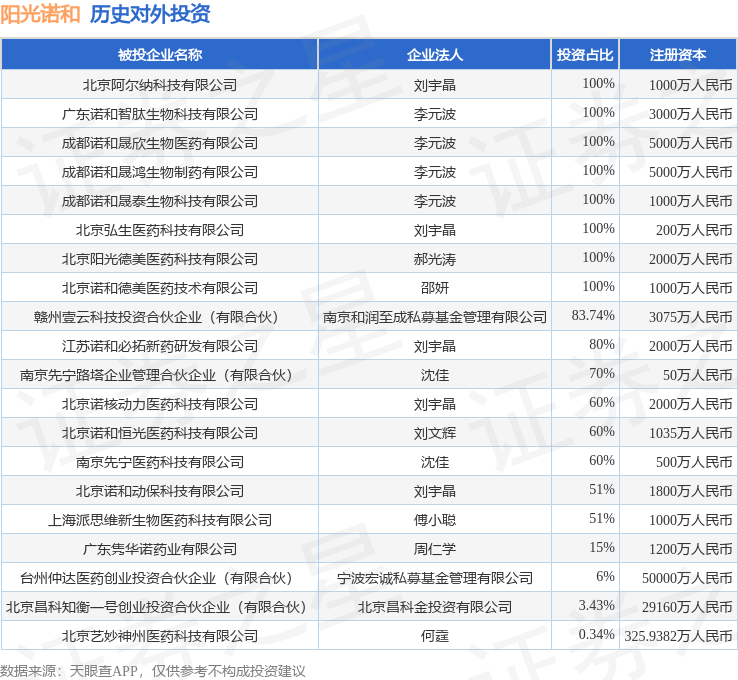 证券之星消息,根据天眼查APP显示,阳光诺和(688621.SH)新增一起对外投资事件,被投资公司为上海弼领生物技术有限公司,法定代表人FUYAO ZHANG,投资占比为-。该公司从事研究和试验发展,注册资本为404.5128万人民币。目前,阳光诺和共存在对外投资22项,投资占比前20的项目见下表: