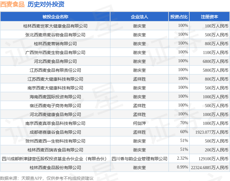 证券之星消息,根据天眼查APP显示,西麦食品(002956.SZ)新增一起对外投资事件,被投资公司为桂林西麦世家大健康食品有限公司,法定代表人谢庆奎,投资占比为100%。该公司从事食品制造业,注册资本为100万人民币。目前,西麦食品共存在对外投资17项,详见下表: