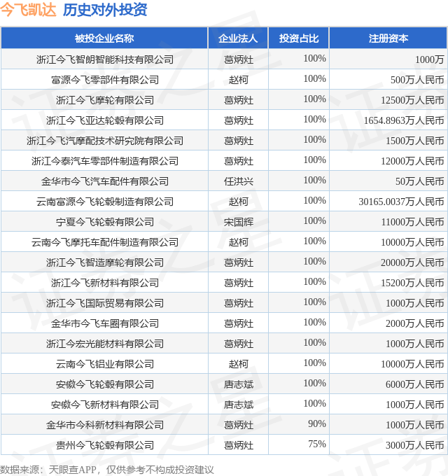 证券之星消息,根据天眼查APP显示,今飞凯达(002863.SZ)新增一起对外投资事件,被投资公司为金华市今飞镁基材料科技有限公司,法定代表人郑勋,投资占比为-。该公司从事铁路、船舶、航空航天和其他运输设备制造业,注册资本为100万人民币。目前,今飞凯达共存在对外投资24项,投资占比前20的项目见下表: