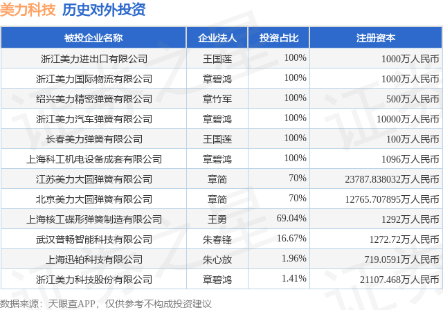 证券之星消息,根据天眼查APP显示,美力科技(300611.SZ)新增一起对外投资事件,被投资公司为浙江美力进出口有限公司,法定代表人王国莲,投资占比为100%。该公司从事批发业,注册资本为1000万人民币。目前,美力科技共存在对外投资12项,详见下表: