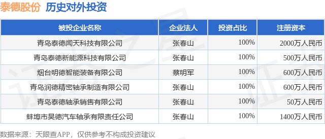 通过天眼查大数据分析,青岛泰德轴承科技股份有限公司共对外投资了6家企业,参与招投标项目19次;财产线索方面有商标信息18条,专利信息100条,著作权信息2条;此外企业还拥有行政许可15个。据2024年报数据,泰德股份商誉1314.89万元。