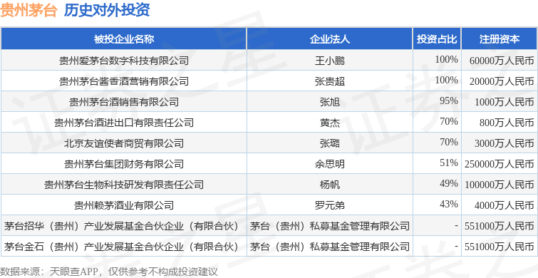 证券之星消息,根据天眼查APP显示,贵州茅台(600519.SH)新增一起对外投资事件,被投资公司为贵州爱茅台数字科技有限公司,法定代表人王小鹏,投资占比为100%。该公司从事互联网和相关服务,注册资本为60000万人民币。目前,贵州茅台共存在对外投资10项,详见下表: