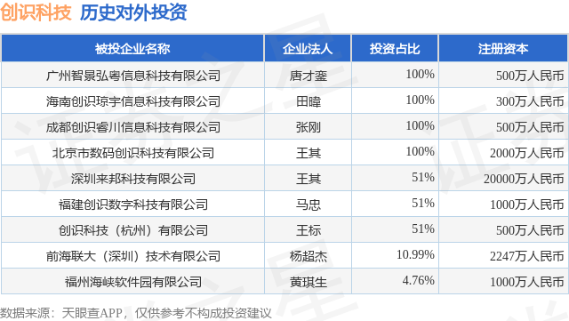 证券之星消息,根据天眼查APP显示,创识科技(300941.SZ)新增一起对外投资事件,被投资公司为深圳来邦科技有限公司,法定代表人王其,投资占比为51%。该公司从事计算机、通信和其他电子设备制造业,注册资本为20000万人民币。目前,创识科技共存在对外投资9项,详见下表: