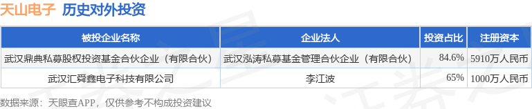 证券之星消息,根据天眼查APP显示,天山电子(301379.SZ)新增一起对外投资事件,被投资公司为武汉汇舜鑫电子科技有限公司,法定代表人李江波,投资占比为65%。该公司从事科技推广和应用服务业,注册资本为1000万人民币。目前,天山电子共存在对外投资2项,详见下表: