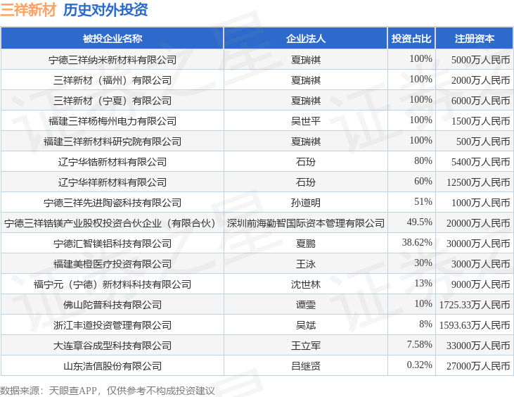 证券之星消息,根据天眼查APP显示,三祥新材(603663.SH)新增一起对外投资事件,被投资公司为福宁元(宁德)新材料科技有限公司,法定代表人沈世林,投资占比为13%。该公司从事有色金属冶炼和压延加工业,注册资本为9000万人民币。目前,三祥新材共存在对外投资16项,详见下表: