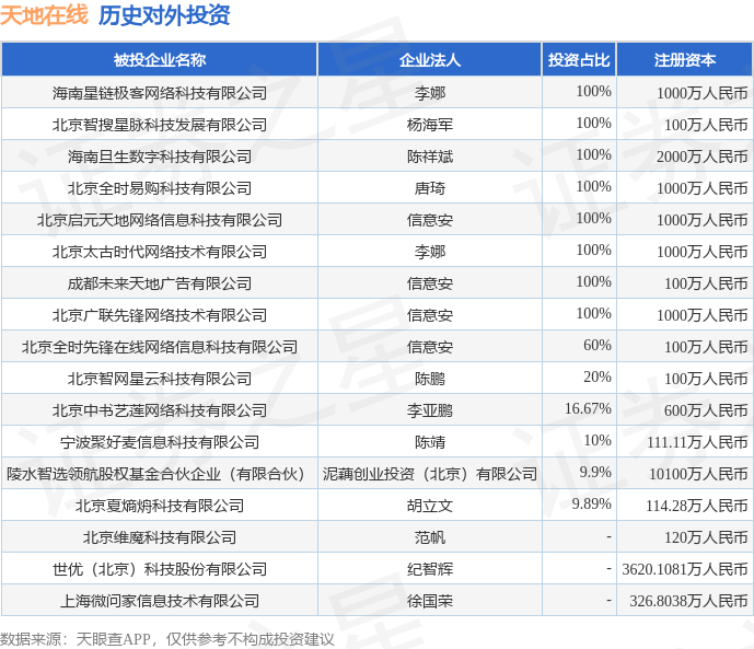证券之星消息,根据天眼查APP显示,天地在线(002995.SZ)新增一起对外投资事件,被投资公司为海南星链极客网络科技有限公司,法定代表人李娜,投资占比为100%。该公司从事互联网和相关服务,注册资本为1000万人民币。目前,天地在线共存在对外投资17项,详见下表: