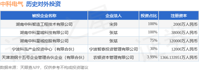 证券之星消息,根据天眼查APP显示,中科电气(300035.SZ)新增一起对外投资事件,被投资公司为湖南中科星城控股有限公司,法定代表人张斌,投资占比为75%。该公司从事其他金融业,注册资本为120000万人民币。目前,中科电气共存在对外投资5项,详见下表: