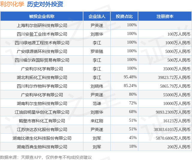 通过天眼查大数据分析,利尔化学股份有限公司共对外投资了16家企业,参与招投标项目191次;财产线索方面有商标信息111条,专利信息275条;此外企业还拥有行政许可719个。据2024年报数据,利尔化学商誉2251.58万元,同比未变化。