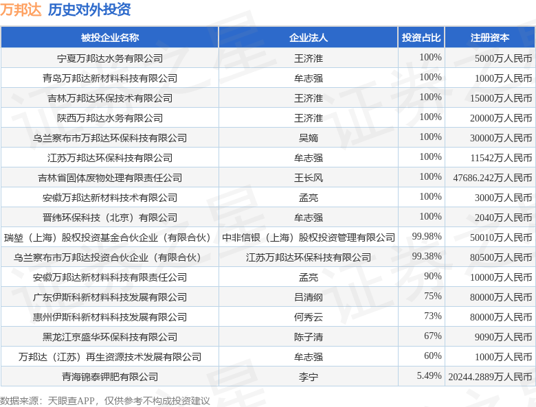 证券之星消息,根据天眼查APP显示,万邦达(300055.SZ)新增一起对外投资事件,被投资公司为安徽万邦达新材料科技有限责任公司,法定代表人孟亮,投资占比为90%。该公司从事汽车制造业,注册资本为10000万人民币。目前,万邦达共存在对外投资17项,详见下表: