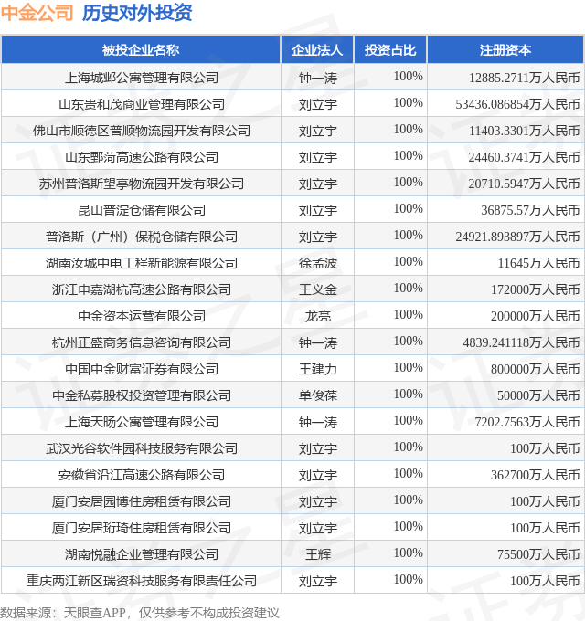 证券之星消息,根据天眼查APP显示,中金公司(601995.SH)新增一起对外投资事件,被投资公司为陕西旅游文化产业股份有限公司,法定代表人马婷,投资占比为0.28%。该公司从事商务服务业,注册资本为5800万人民币。目前,中金公司共存在对外投资169项,投资占比前20的项目见下表: