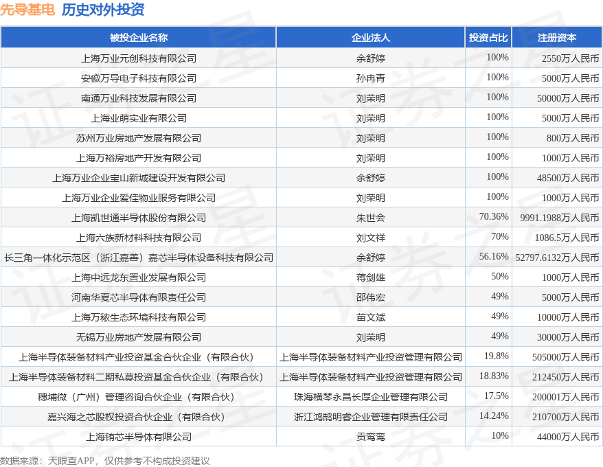 证券之星消息,根据天眼查APP显示,先导基电(600641.SH)新增一起对外投资事件,被投资公司为上海六族新材料科技有限公司,法定代表人刘文祥,投资占比为70%。该公司从事零售业,注册资本为1086.5万人民币。目前,先导基电共存在对外投资22项,投资占比前20的项目见下表: