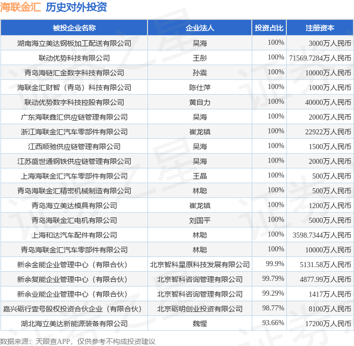 证券之星消息,根据天眼查APP显示,海联金汇(002537.SZ)新增一起对外投资事件,被投资公司为共青城银栾创业投资合伙企业(有限合伙),法定代表人厦门纵横金鼎私募基金管理有限公司,投资占比为9.01%。该公司从事资本市场服务,注册资本为5000万人民币。目前,海联金汇共存在对外投资34项,投资占比前20的项目见下表: