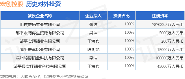 证券之星消息,根据天眼查APP显示,宏创控股(002379.SZ)新增一起对外投资事件,被投资公司为山东宏拓实业有限公司,法定代表人张波,投资占比为100%。该公司从事有色金属冶炼和压延加工业,注册资本为787032.5万人民币。目前,宏创控股共存在对外投资6项,详见下表: