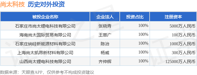 证券之星消息,根据天眼查APP显示,尚太科技(001301.SZ)新增一起对外投资事件,被投资公司为石家庄市尚太锂电科技有限公司,法定代表人张晓青,投资占比为100%。该公司从事电气机械和器材制造业,注册资本为5000万人民币。目前,尚太科技共存在对外投资5项,详见下表:
