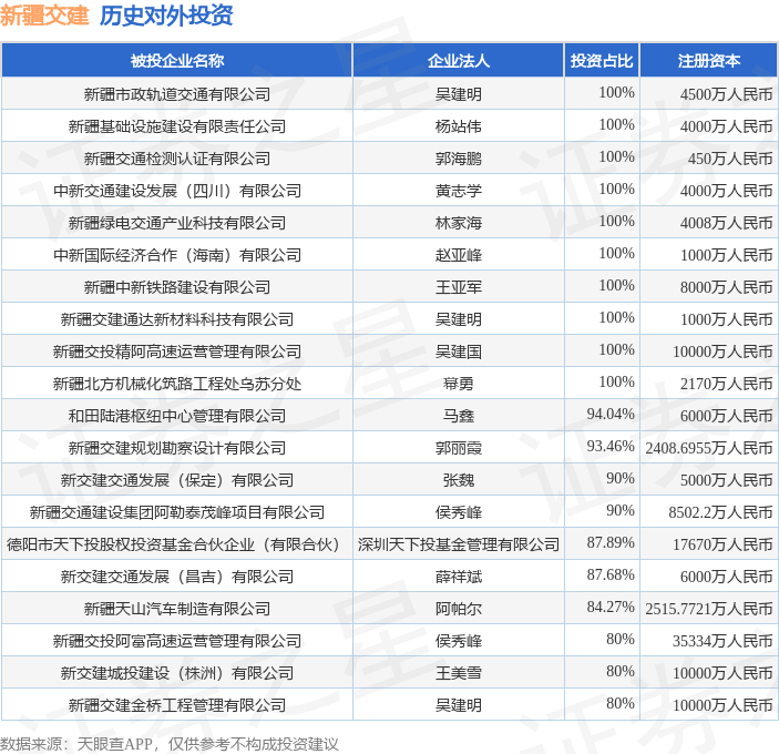 证券之星消息,根据天眼查APP显示,新疆交建(002941.SZ)新增一起对外投资事件,被投资公司为新交建(喀什)建设发展有限公司,法定代表人刘晶,投资占比为51%。该公司从事房屋建筑业,注册资本为4000万人民币。目前,新疆交建共存在对外投资52项,投资占比前20的项目见下表: