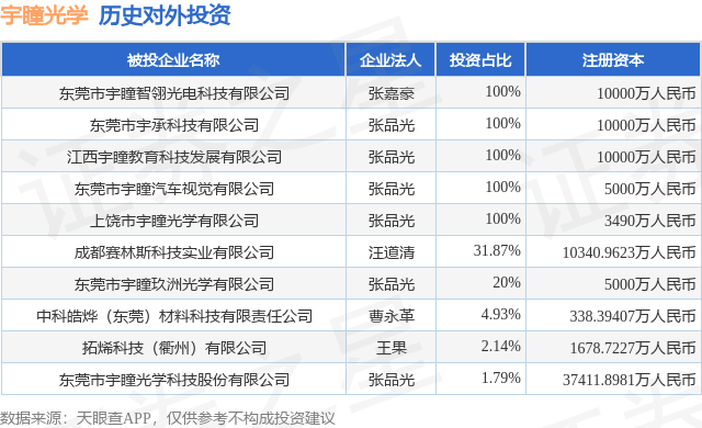 证券之星消息,根据天眼查APP显示,宇瞳光学(300790.SZ)新增一起对外投资事件,被投资公司为拓烯科技(衢州)有限公司,法定代表人王果,投资占比为2.14%。该公司从事化学原料和化学制品制造业,注册资本为1678.7227万人民币。目前,宇瞳光学共存在对外投资10项,详见下表: