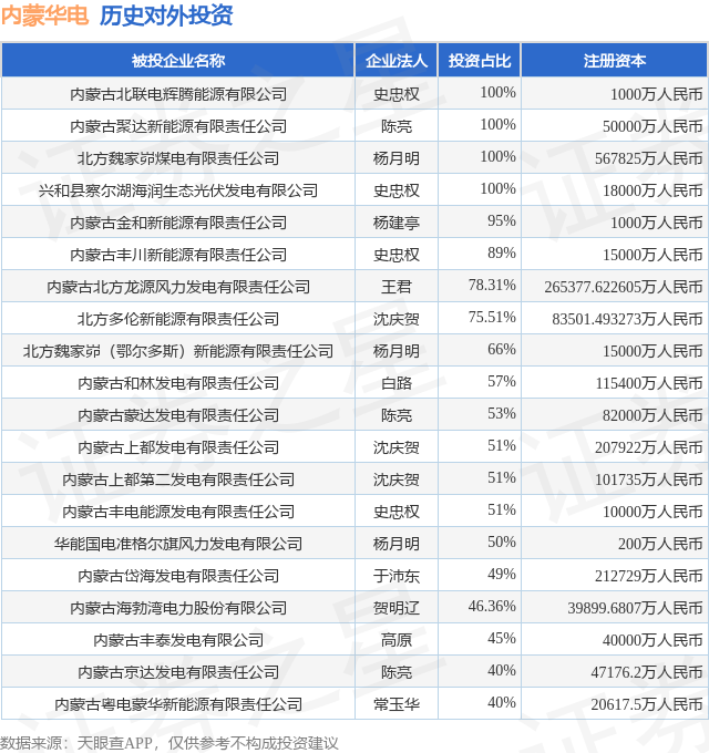 通过天眼查大数据分析,内蒙古蒙电华能热电股份有限公司共对外投资了35家企业,参与招投标项目6476次;此外企业还拥有行政许可6个。据2024年报数据,内蒙华电商誉4700.12万元,同比减37.66%。长期股权投资21.33亿元,同比增12.39%。