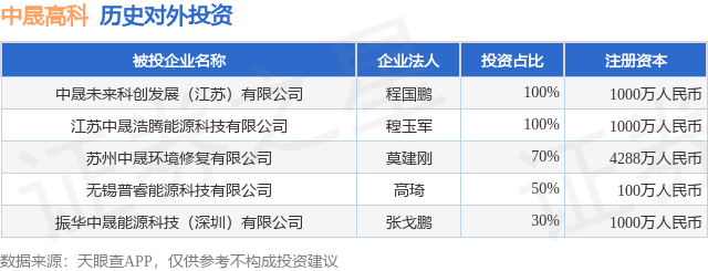 证券之星消息,根据天眼查APP显示,中晟高科(002778.SZ)新增一起对外投资事件,被投资公司为中晟未来科创发展(江苏)有限公司,法定代表人程国鹏,投资占比为100%。该公司从事软件和信息技术服务业,注册资本为1000万人民币。目前,中晟高科共存在对外投资5项,详见下表: