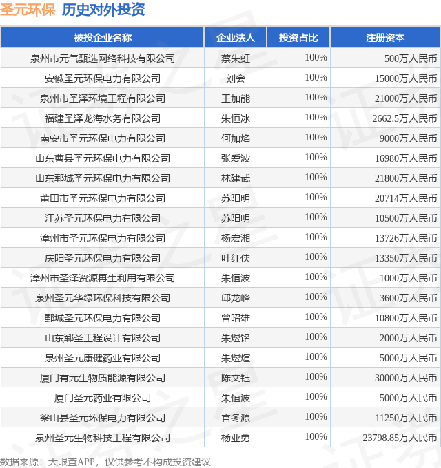 证券之星消息,根据天眼查APP显示,圣元环保(300867.SZ)新增一起对外投资事件,被投资公司为泉州市元气甄选网络科技有限公司,法定代表人蔡朱虹,投资占比为100%。该公司从事软件和信息技术服务业,注册资本为500万人民币。目前,圣元环保共存在对外投资32项,投资占比前20的项目见下表: