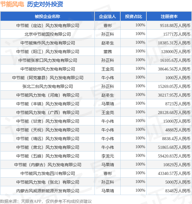 证券之星消息,根据天眼查APP显示,节能风电(601016.SH)新增一起对外投资事件,被投资公司为中节能(呼和浩特新城区)能源有限公司,法定代表人马果靖,投资占比为95%。该公司从事电力、热力生产和供应业,注册资本为1000万人民币。目前,节能风电共存在对外投资66项,投资占比前20的项目见下表:
