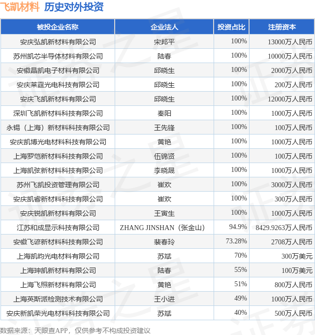 证券之星消息,根据天眼查APP显示,飞凯材料(300398.SZ)新增一起对外投资事件,被投资公司为安庆弘凯新材料有限公司,法定代表人宋邦平,投资占比为100%。该公司从事化学原料和化学制品制造业,注册资本为13000万人民币。目前,飞凯材料共存在对外投资40项,投资占比前20的项目见下表: