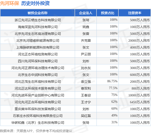 证券之星消息,根据天眼查APP显示,先河环保(300137.SZ)新增一起对外投资事件,被投资公司为石家庄水投环境科技有限责任公司,法定代表人吴红磊,投资占比为49%。该公司从事生态保护和环境治理业,注册资本为1000万人民币。目前,先河环保共存在对外投资16项,详见下表: