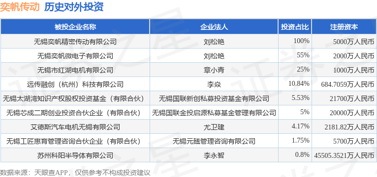 证券之星消息,根据天眼查APP显示,奕帆传动(301023.SZ)新增一起对外投资事件,被投资公司为无锡奕帆精密传动有限公司,法定代表人刘松艳,投资占比为100%。该公司从事通用设备制造业,注册资本为5000万人民币。目前,奕帆传动共存在对外投资9项,详见下表: