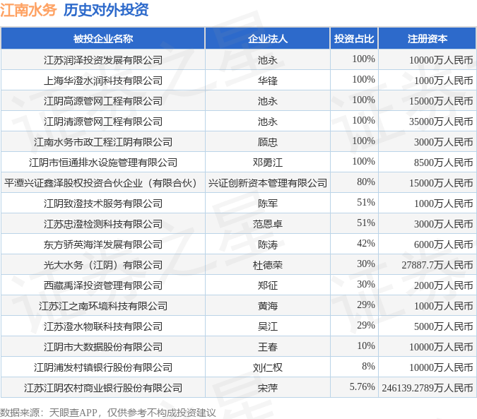 证券之星消息,根据天眼查APP显示,江南水务(601199.SH)新增一起对外投资事件,被投资公司为江阴致澄技术服务有限公司,法定代表人陈军,投资占比为51%。该公司从事金属制品、机械和设备修理业,注册资本为1000万人民币。目前,江南水务共存在对外投资17项,详见下表: