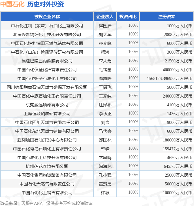 证券之星消息,根据天眼查APP显示,中国石化(600028.SH)新增一起对外投资事件,被投资公司为中石化胜利(东营)石油化工有限公司,法定代表人崔国居,投资占比为100%。该公司从事石油、煤炭及其他燃料加工业,注册资本为1000万人民币。目前,中国石化共存在对外投资198项,投资占比前20的项目见下表: