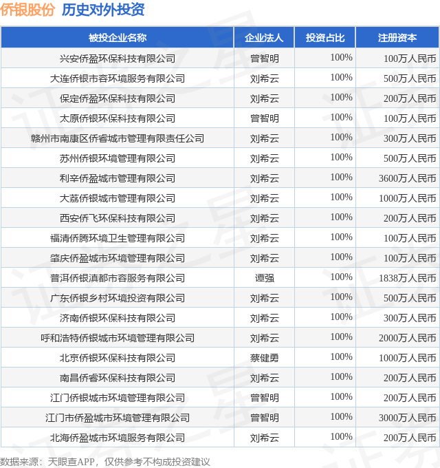 证券之星消息,根据天眼查APP显示,侨银股份(002973.SZ)新增一起对外投资事件,被投资公司为南昌侨东环境卫生有限公司,法定代表人刘宁馨,投资占比为97%。该公司从事公共设施管理业,注册资本为50万人民币。目前,侨银股份共存在对外投资182项,投资占比前20的项目见下表: