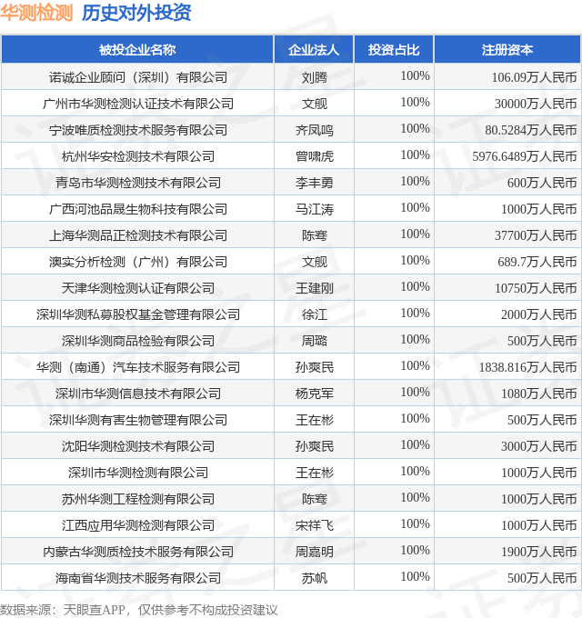 通过天眼查大数据分析,华测检测认证集团股份有限公司共对外投资了68家企业,参与招投标项目8193次;财产线索方面有商标信息249条,专利信息358条,著作权信息65条;此外企业还拥有行政许可125个。据2024年报数据,华测检测商誉10.79亿元,同比增33.96%。长期股权投资3.65亿元,同比增8.53%。