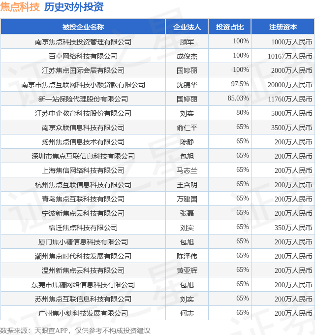证券之星消息,根据天眼查APP显示,焦点科技(002315.SZ)新增一起对外投资事件,被投资公司为南京众联信息科技有限公司,法定代表人俞仁平,投资占比为65%。该公司从事软件和信息技术服务业,注册资本为3500万人民币。目前,焦点科技共存在对外投资33项,投资占比前20的项目见下表: