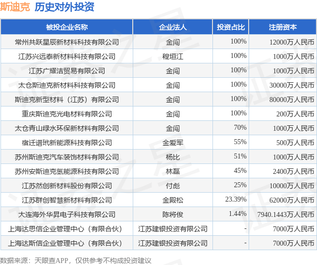 证券之星消息,根据天眼查APP显示,斯迪克(300806.SZ)新增一起对外投资事件,被投资公司为上海达思信企业管理中心(有限合伙),法定代表人江苏建银投资有限公司,投资占比为-。该公司从事商务服务业,注册资本为7000万人民币。目前,斯迪克共存在对外投资15项,详见下表:
