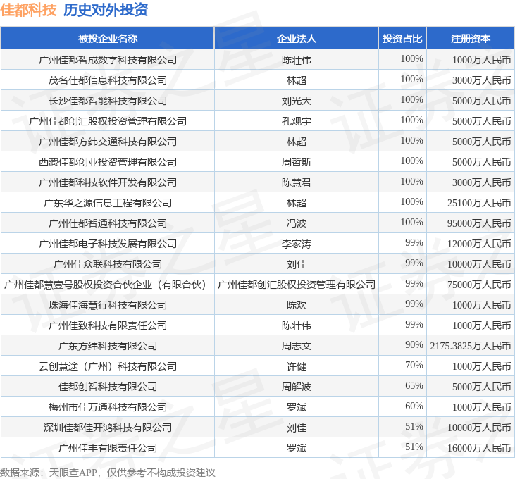 证券之星消息,根据天眼查APP显示,佳都科技(600728.SH)新增一起对外投资事件,被投资公司为广州佳洋数据科技有限公司,法定代表人苏洋,投资占比为40%。该公司从事软件和信息技术服务业,注册资本为500万人民币。目前,佳都科技共存在对外投资51项,投资占比前20的项目见下表: