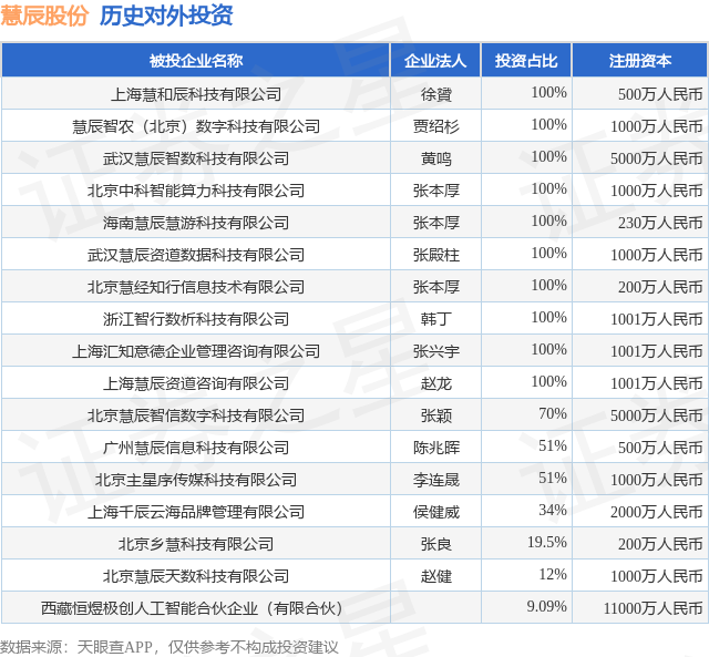 证券之星消息,根据天眼查APP显示,慧辰股份(688500.SH)新增一起对外投资事件,被投资公司为西藏恒煜极创人工智能合伙企业(有限合伙),法定代表人,投资占比为9.09%。该公司从事软件和信息技术服务业,注册资本为11000万人民币。目前,慧辰股份共存在对外投资17项,详见下表: