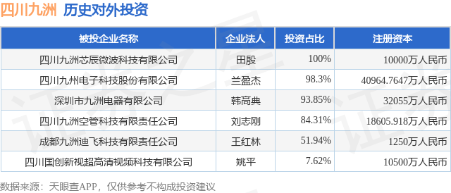 证券之星消息,根据天眼查APP显示,四川九洲(000801.SZ)新增一起对外投资事件,被投资公司为四川九洲芯辰微波科技有限公司,法定代表人田殷,投资占比为100%。该公司从事研究和试验发展,注册资本为10000万人民币。目前,四川九洲共存在对外投资6项,详见下表: