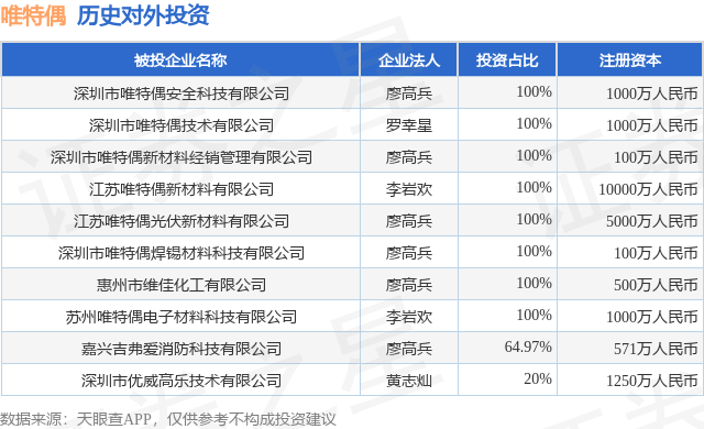 通过天眼查大数据分析,深圳市唯特偶新材料股份有限公司共对外投资了9家企业,参与招投标项目14次;财产线索方面有商标信息25条,专利信息77条;此外企业还拥有行政许可19个。据2024年报数据,唯特偶商誉26.41万元,同比未变化。长期股权投资254.04万元。